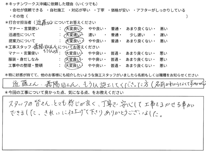 「スタッフの皆さんとても感じが良く、丁寧で安心して工事をまかせる事ができました。きれいに仕上げて下さりありがとうございました。」
