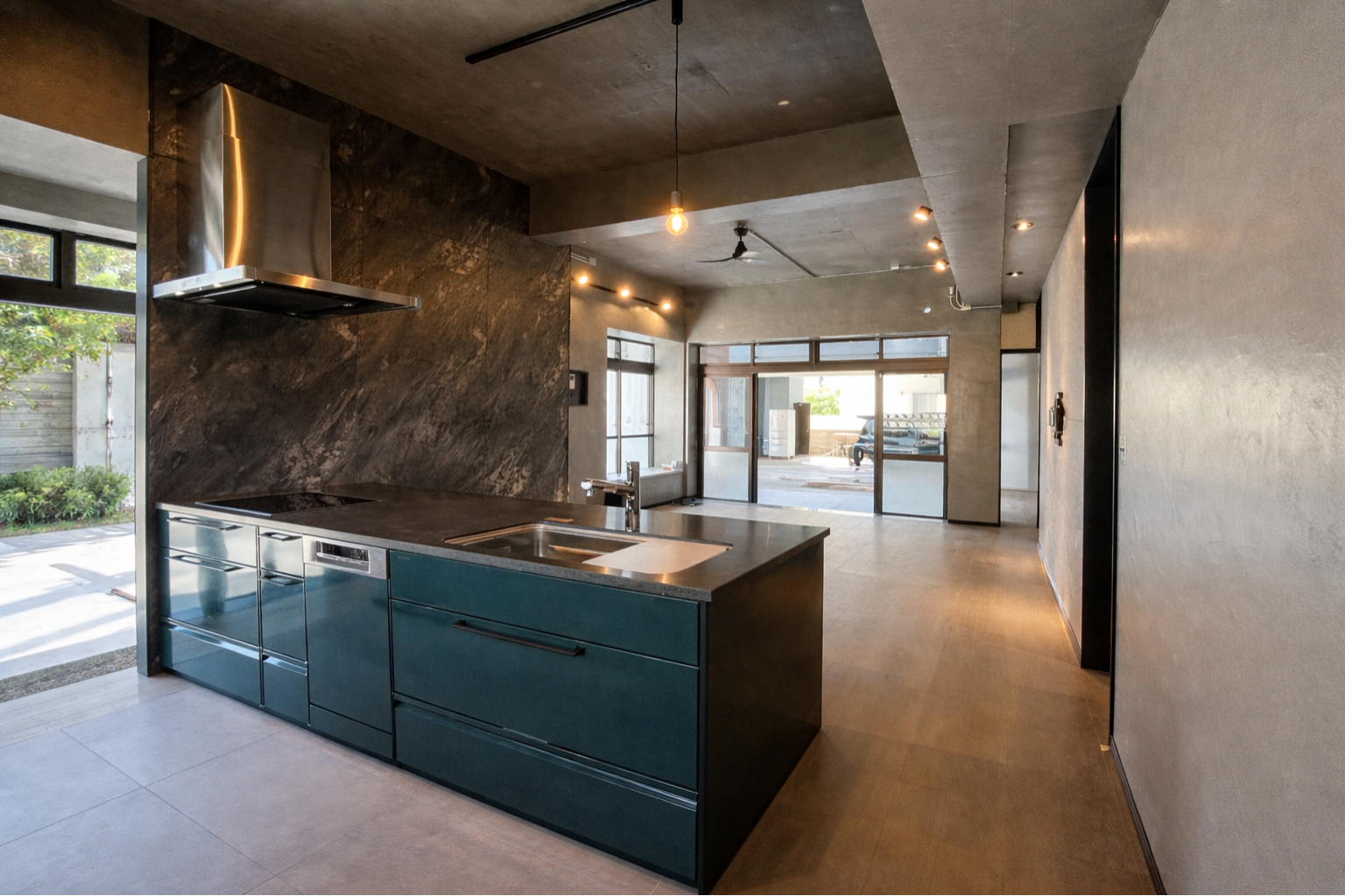 天然石のような力強い質感が空間全体を引き締め、ホテルライクで重厚感のある雰囲気を醸し出しています。