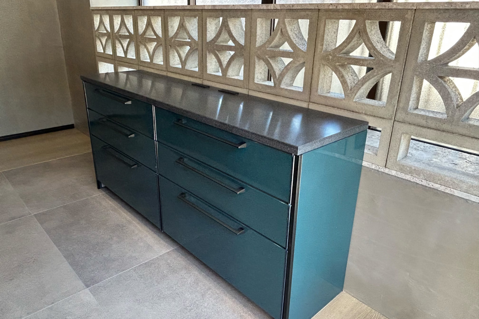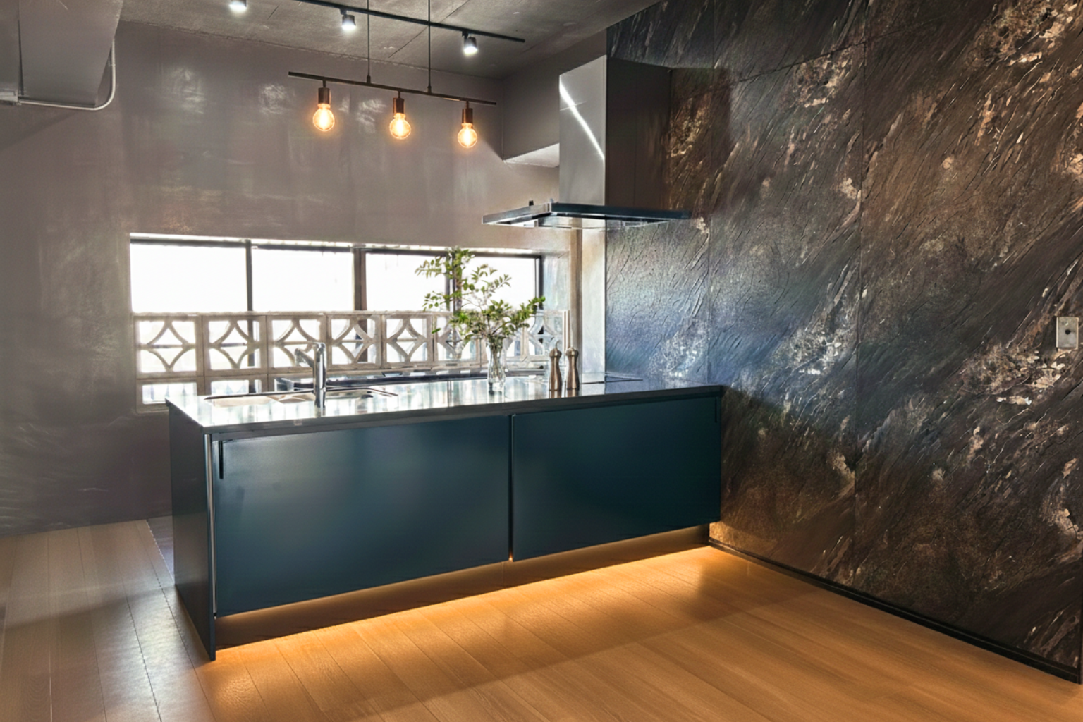 リノベーション施工事例| 素材が映える、ブルーグリーンのキッチン空間|沖縄県うるま市