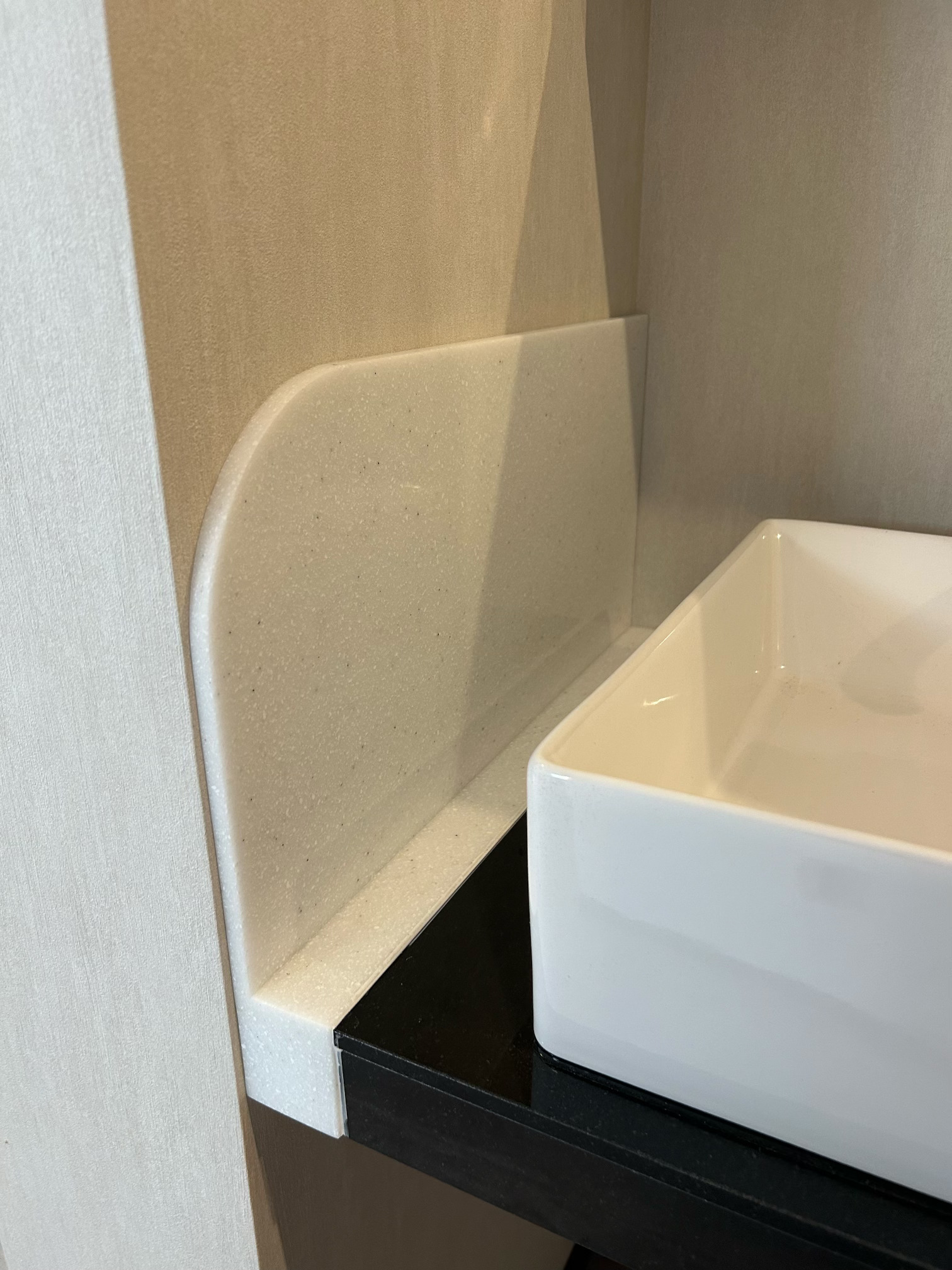 また、水ハネ防止のため、自社工場で製作した人工大理石製のパネルも設置。