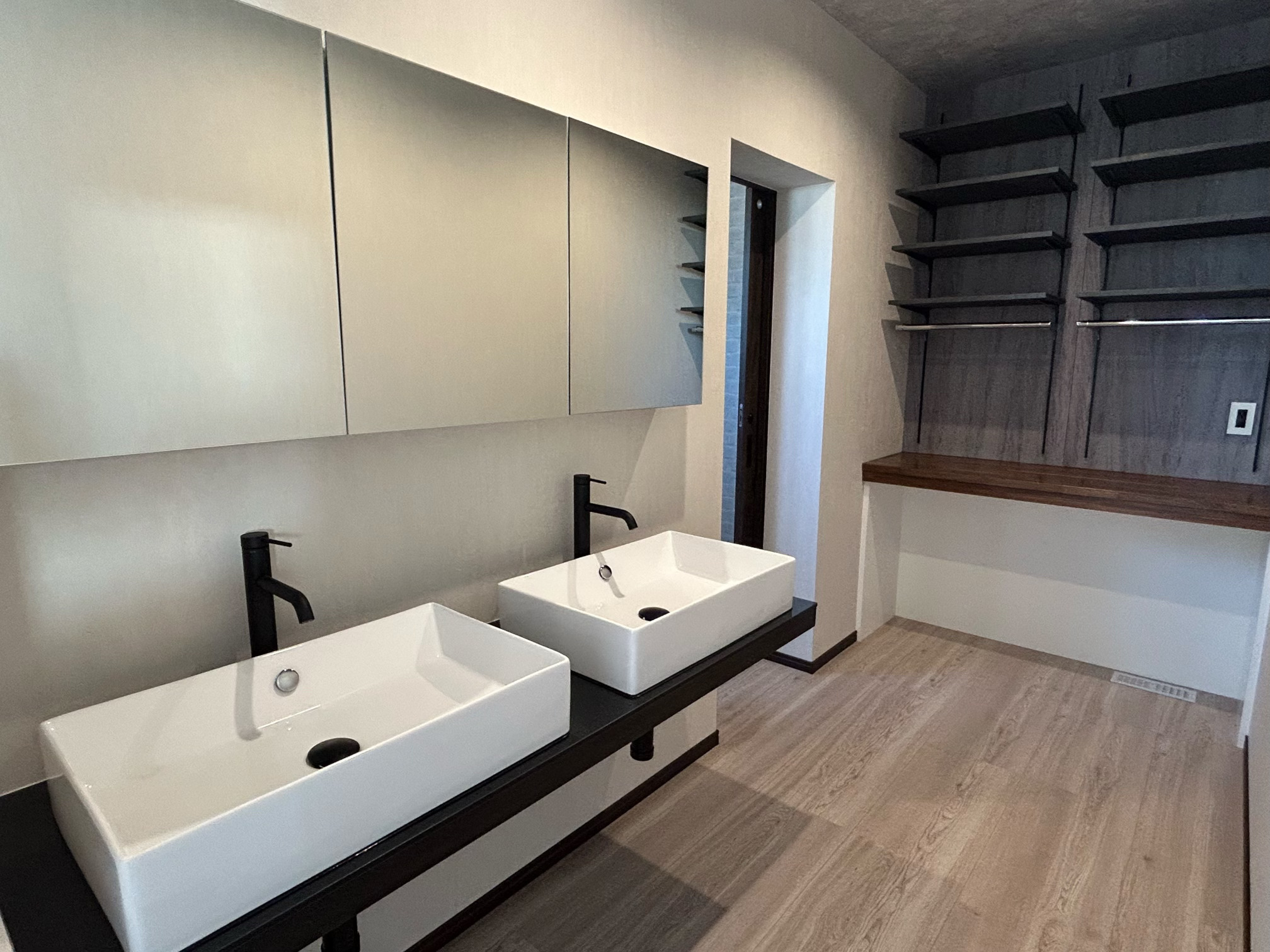 黒御影石天板の2ボウル造作洗面台と家事スペース|沖縄県うるま市 新築戸建て
