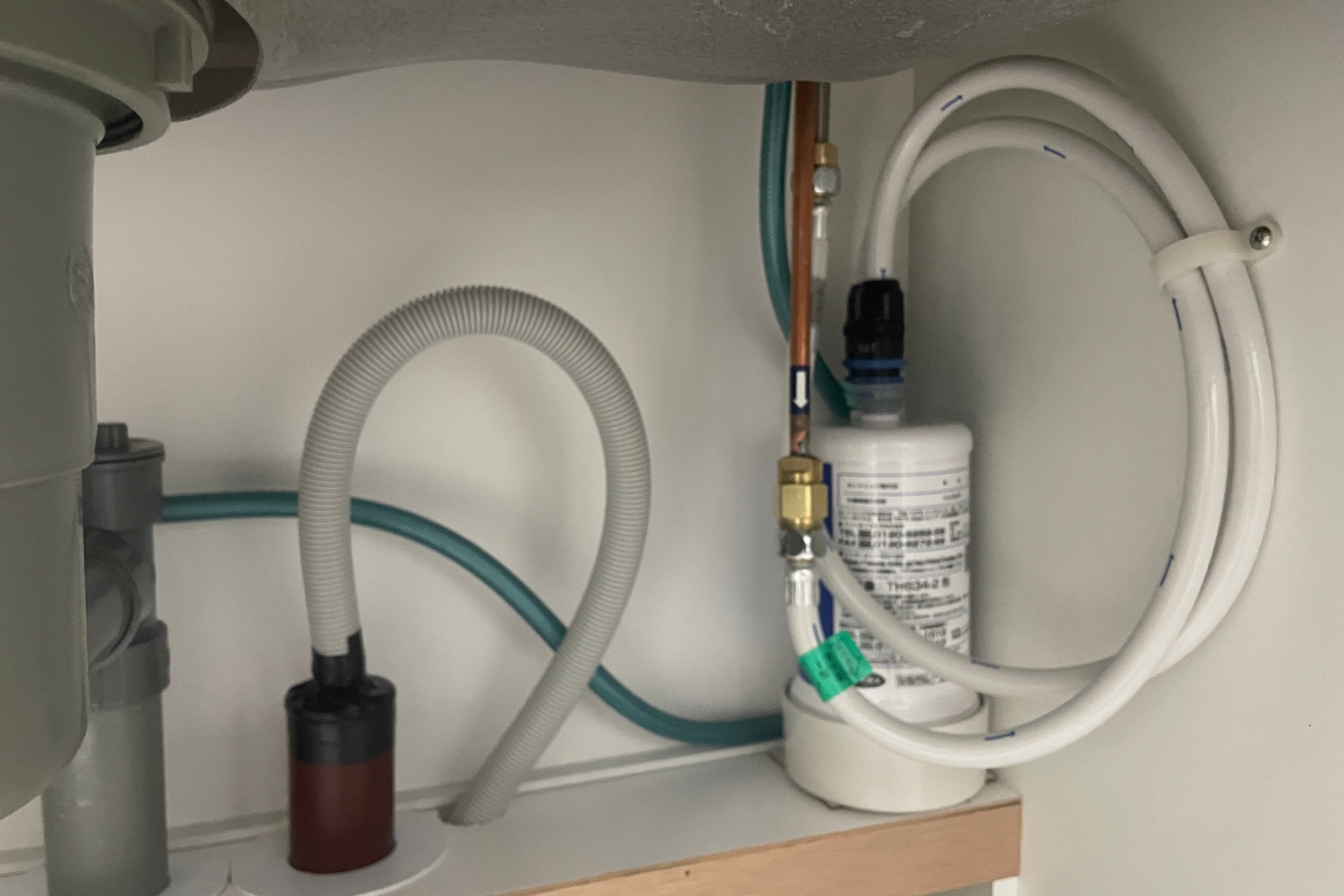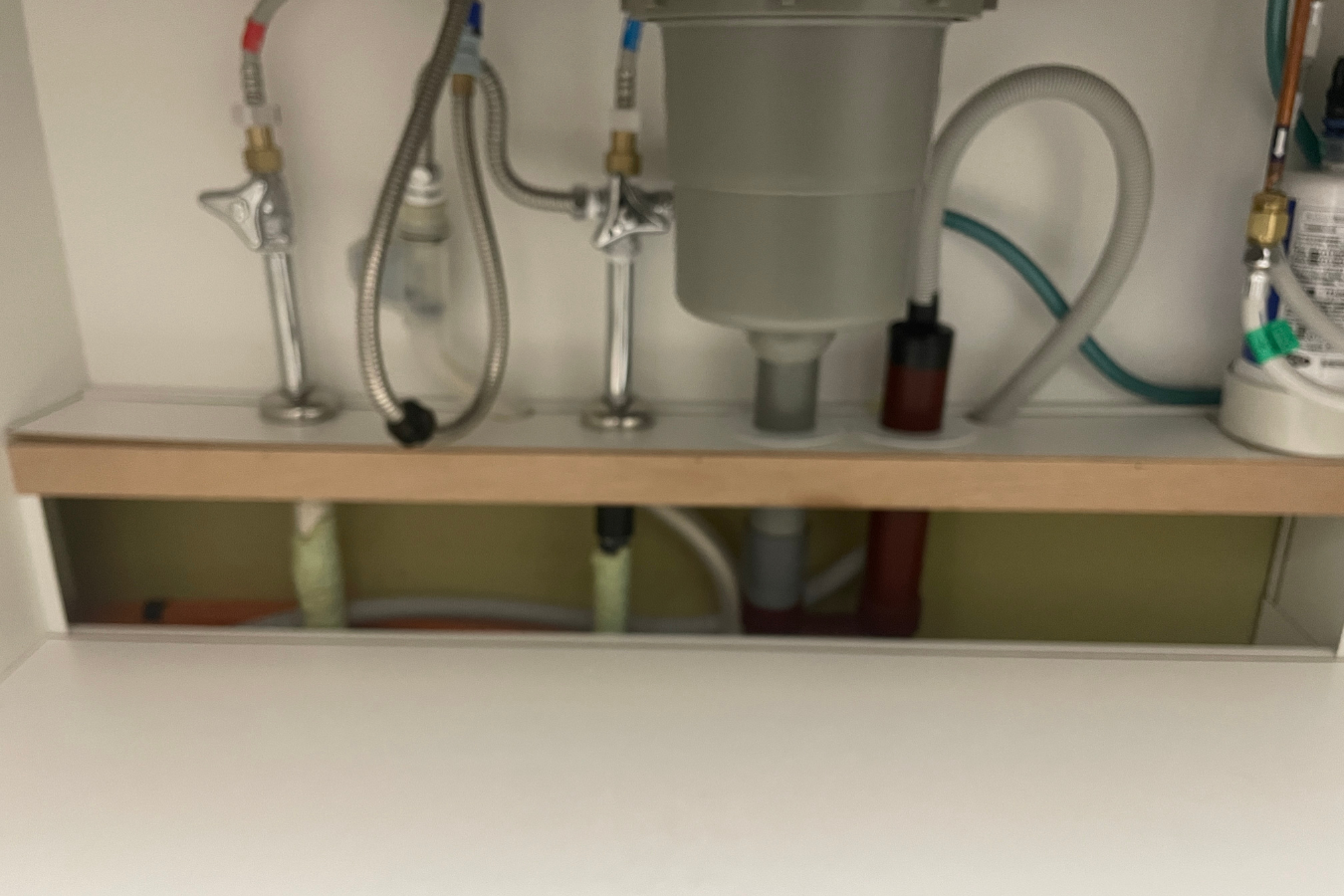 シンク下キャビネットを設置後、Bosch食洗機の配管・浄水器の配管も接続完了です。 |