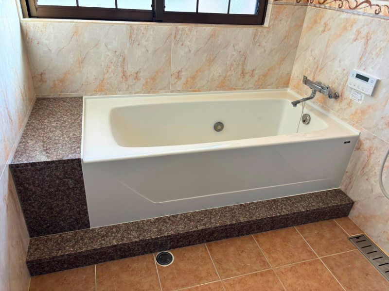 中古外人住宅の浴室リフォーム|大きすぎる据え置き浴槽を1600サイズ&追い焚き付きに