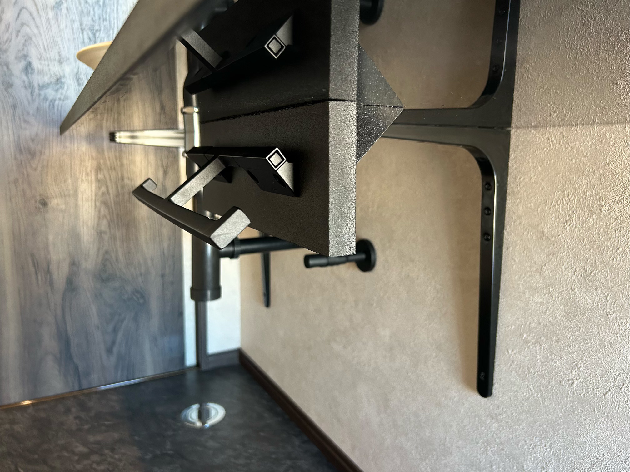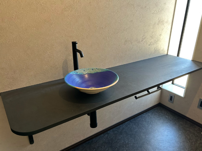 黒を貴重とした広々なトイレに、弊社の石工場(中部大理石)でオーダー加工したカウンターを採用しました。