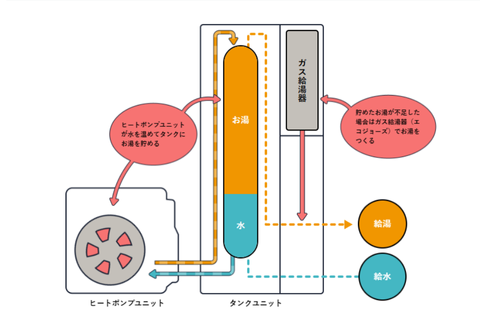 エコワンはエコキュートのように電気を活用しヒートポンプで温水をつくりタンクに貯水する機能と、従来の方式と同じガス給湯器による瞬間的にお湯をつくる機能の2つを備えています。